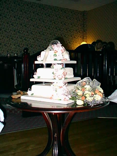 Here`s the cake (Hmmmmmmm lovely) Well it`s a three tier top two are Sponge & the bottom one is fruit. The reason we did this is because a lot of ppl these days don`t eat fruit (Strange ppl? I love fruit cake) | |||||||||||||||||||||||